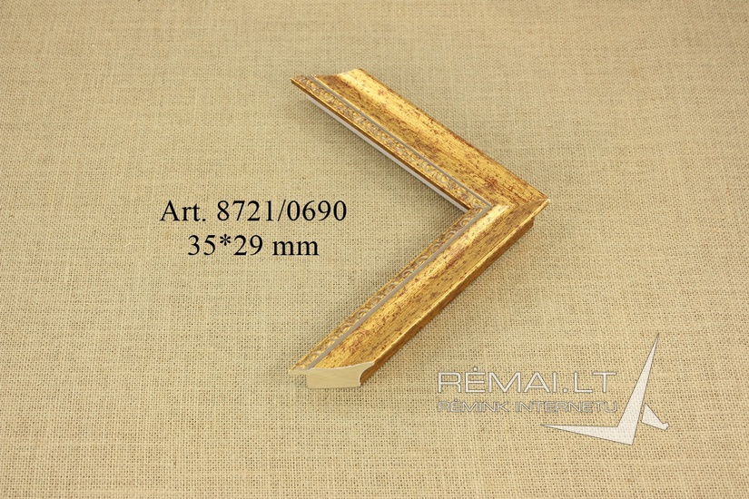 Klasikinis auksinis sendinto stiliaus lygaus, įgaubto profilio medinis rėmas su ornamentine juostele ties vidine kraštine ir margintas raudonomis dėmelėmis.