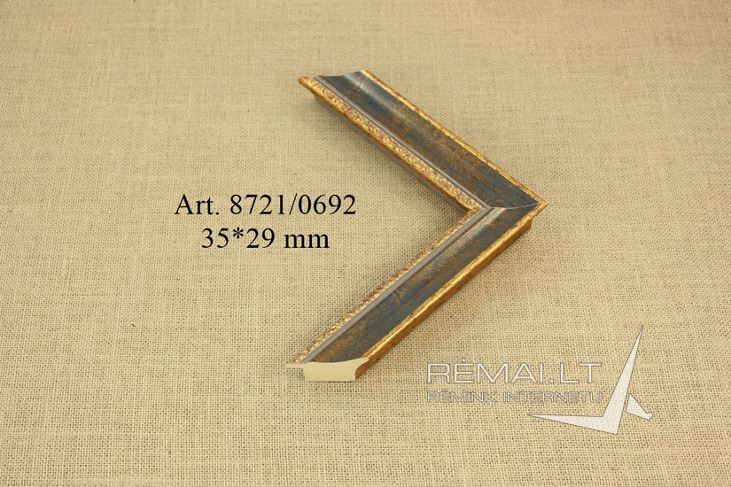 Klasikinis auksinis sendinto stiliaus lygaus, įgaubto profilio medinis rėmas su ornamentine juostele ties vidine kraštine ir melsva juosta.