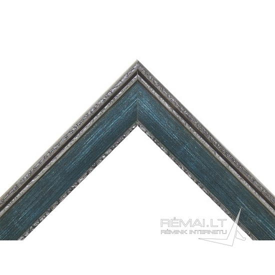 Sodriai mėlynas su sidabriniu blizgesiu medinis rėmas, dekoruotas tamsesnėmis sidabrinėmis kraštinėmis. Vidutinio pločio, lygus ir gilus profilis puikiai tinka rėminti drobėms su porėmiu.