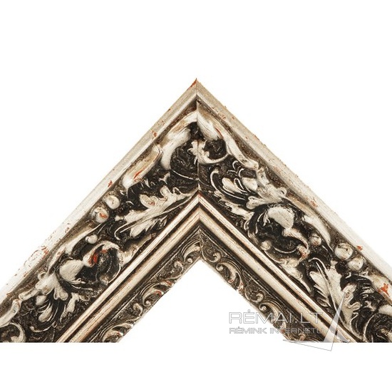 Prabangus ir puošnus sendinto klasikinio stiliaus sidabrinės spalvos medinis rėmas. Plataus, įgaubto profilio rėmas, dekoruotas augalinių motyvų ornamentais.