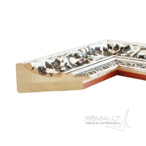 Prabangus ir puošnus sendinto klasikinio stiliaus sidabrinės spalvos medinis rėmas. Plataus, įgaubto profilio rėmas, dekoruotas augalinių motyvų ornamentais.