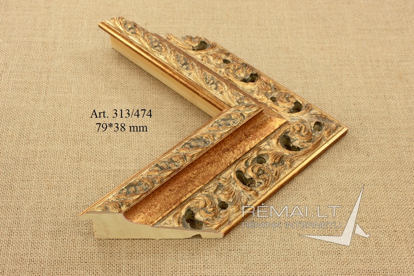 Prabangus sendintas klasikinio stiliaus margo aukso spalvos medinis rėmas su iškiliais augaliniais ornamentais ir kiaurymėmis. Plataus, išgaubto ir gilaus profilio rėmas puikiai tinka rėminti paveikslus su porėmiu.