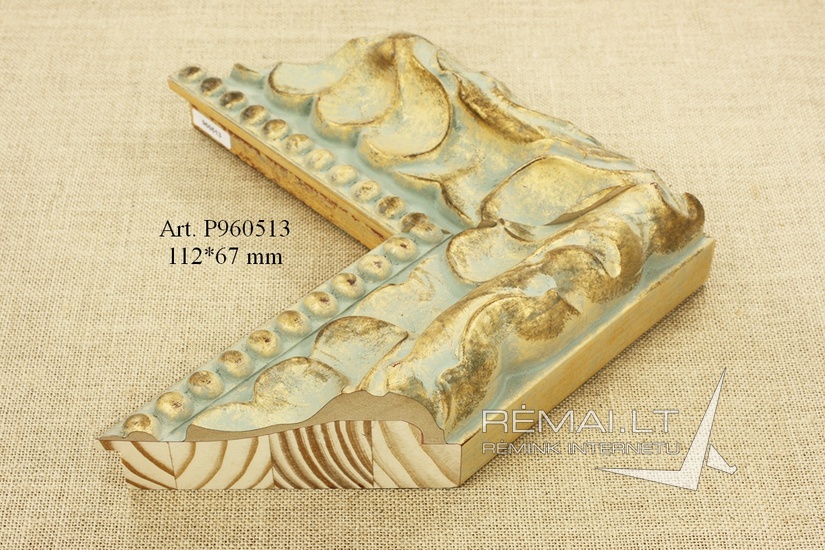 Itin prabangus subtilių melsvų ir bronzinių atspalvių medinis rėmas, kurio paviršius dekoruotas stambiu abstrakčiu augalinių motyvų ir "perlų vėrinio" ornamentu. Labai platus, gilus profilis puikiai tinka rėminti drobėms su porėmiu ir veidrodžiams.