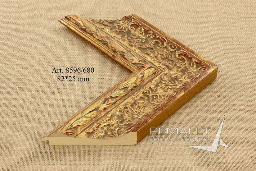 Klasikinis sendinto stiliaus auksinės spalvos medinis rėmas su smulkiais elegantiškais ornamentais ir rausvomis dėmelėmis.