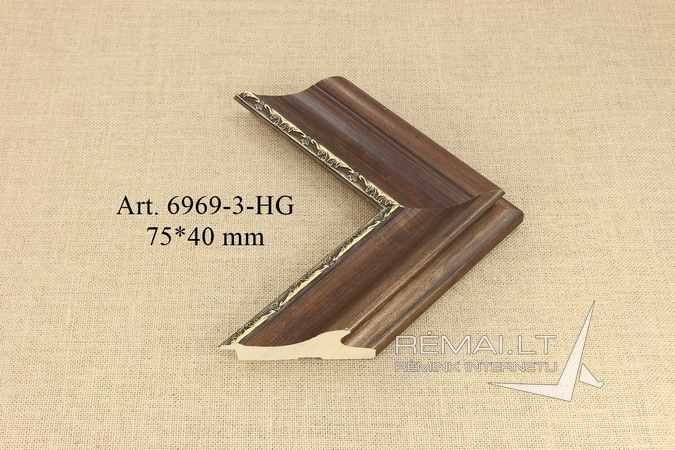 Solidus klasikinis rudos spalvos medinis rėmas su smulkiu sendintu auksiniu ornamentu. Plataus, įgaubto profilio, su natūralios medienos raštu.