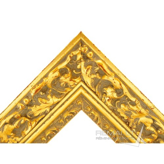 Prabangus ir puošnus sendinto klasikinio stiliaus auksinės spalvos medinis rėmas. Plataus, įgaubto profilio rėmas, dekoruotas augalinių motyvų ornamentais.