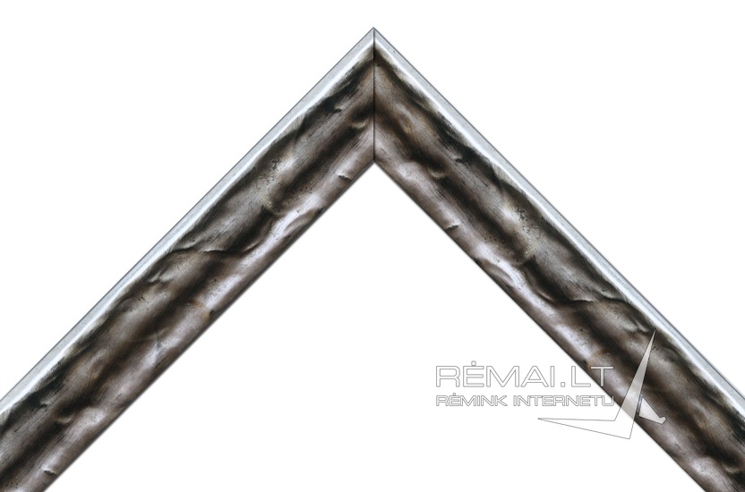 Ornamentinis siauro profilio pilkšvai sidabrinis blizgus modernus medinis rėmelis.