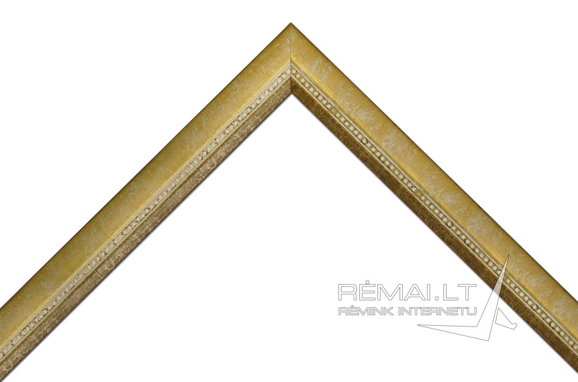 Stilingas, sendinto stiliaus, blizgantis, auksinis rėmas. Siauro, išgaubto profilio. Rėma spuoštas iškilių taškelių linija, primenančia metalines detales. Griežtumo ir modernumo rėmui suteikia pro auksinius motyvus prasiveržiantys balti ruoželiai.