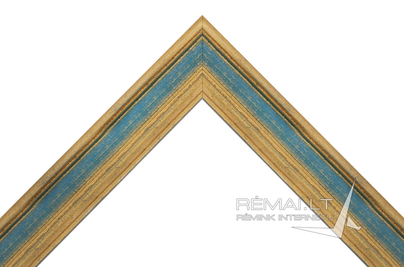 Prabangus ir itin spindintis žydros ir aukso spalvų derinio rėmas. Plataus, klasikinio profilio. Sendinto efekto rėmo paviršius gausiai puoštas aukso dulkių sluoksniu. Šis rėmas suteiks elegancijos Jūsų pasirinktam meno kūriniui.