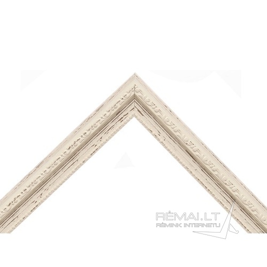 Baltas plastikinis rėmas, su medžio imitacija, tinkamas paveikslams, grafikos kūriniams. Su ornamentais.