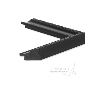 Juodas plastikinis rėmas, tinkamas paveikslams, grafikos kūriniams. Su ornamentais.