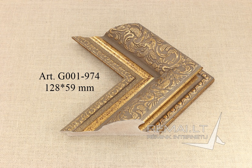 Prabangus klasikinis sendinto stiliaus itin plataus, įgaubto profilio plastikinis auksinės spalvos rėmas su ornamentais.