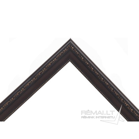 Tamsiai rudas plastikinis rėmas, tinkamas paveikslams, grafikos kūriniams. Su ornamentais.